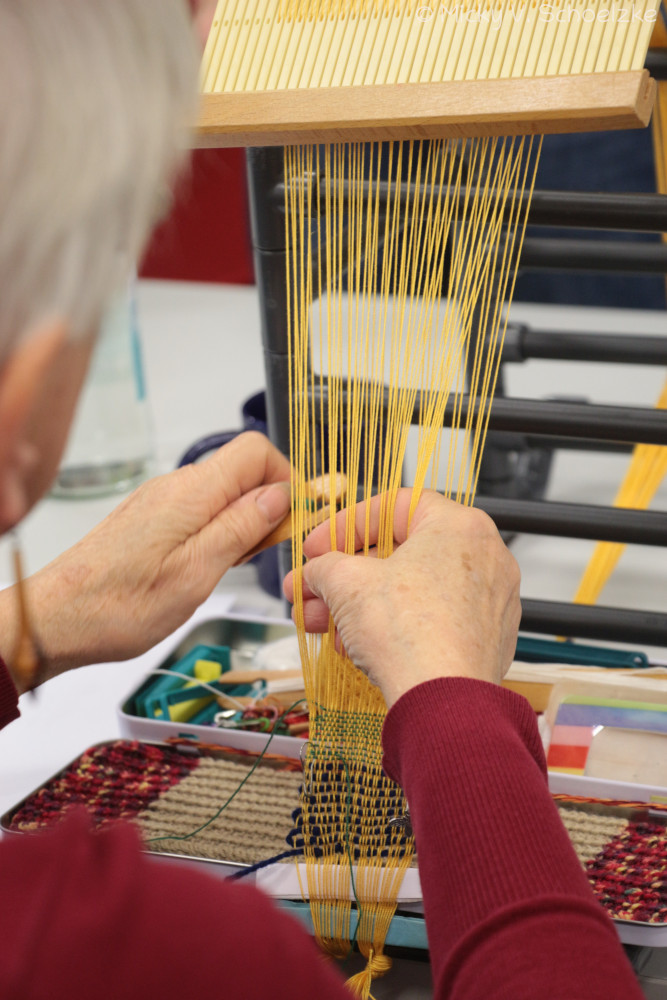 Comme d’habitude, l’espace a vite été occupé par pas mal de métiers à tisser, de chaînes tendues entre des serre-joints sur la table, des pelotes et des cônes de différentes matières et coloris. Au forum, on essaie toujours plein de trucs et chacun peut venir avec des questions ou des sujets qu’il souhaite approfondir.
