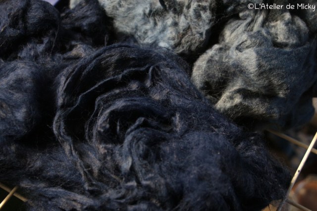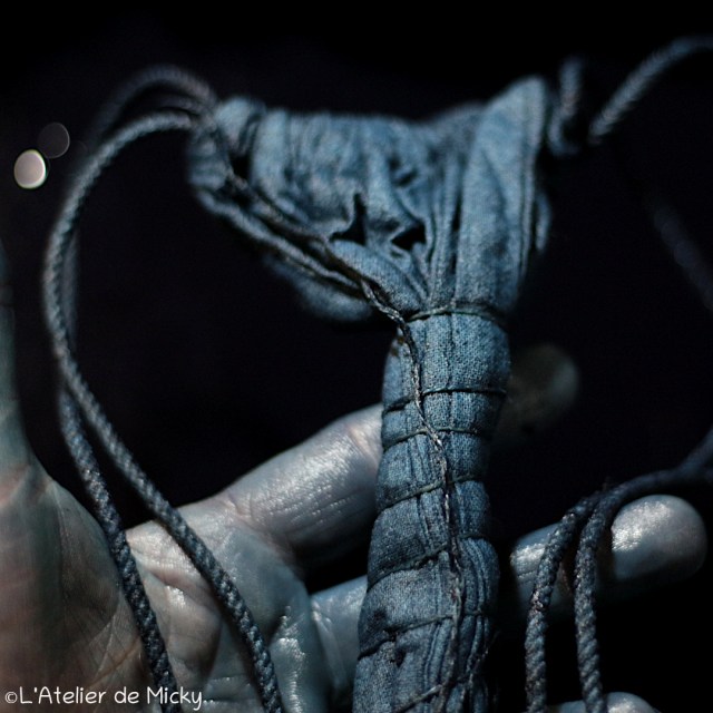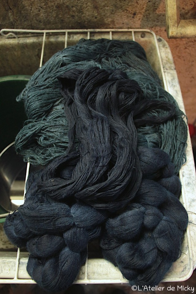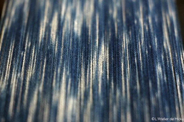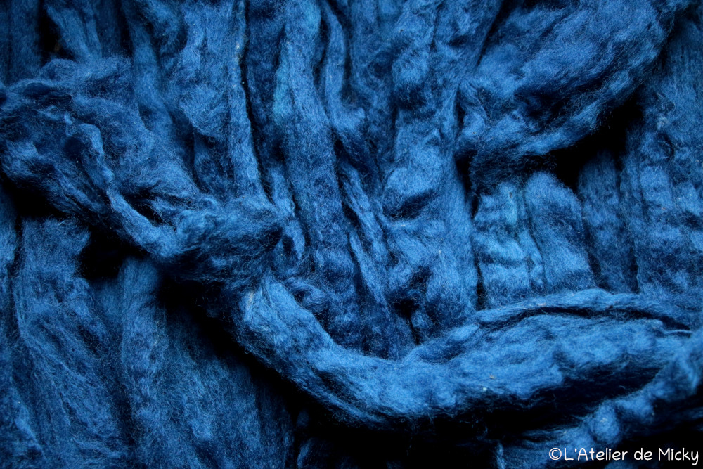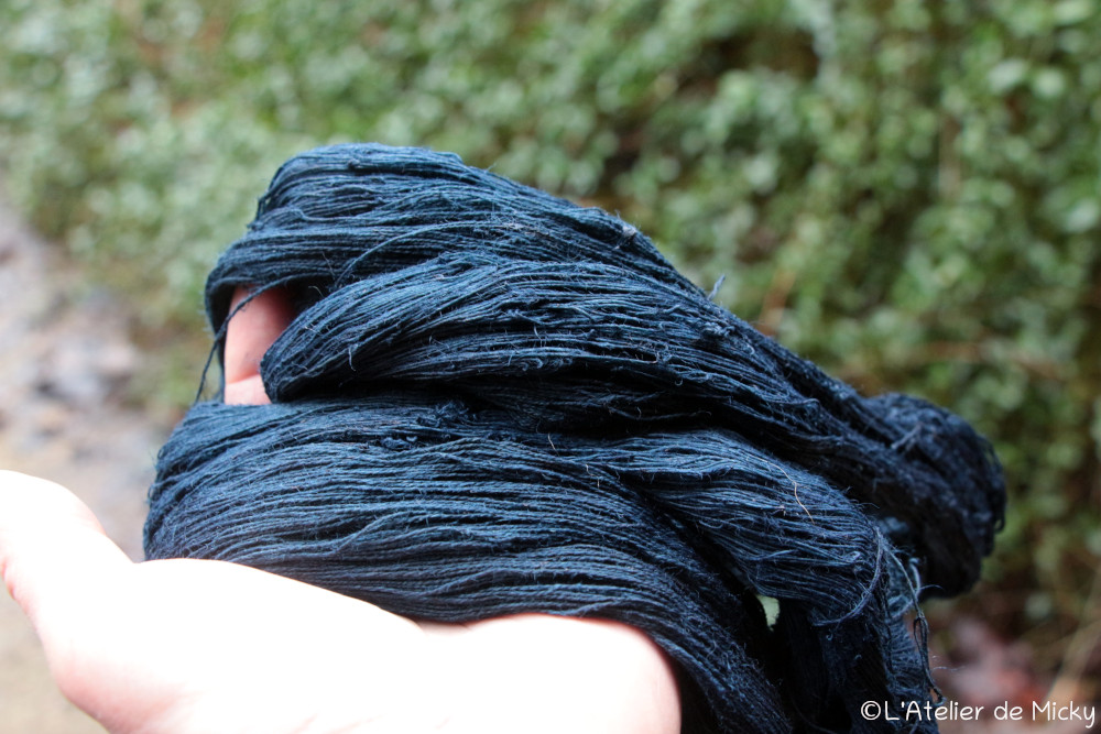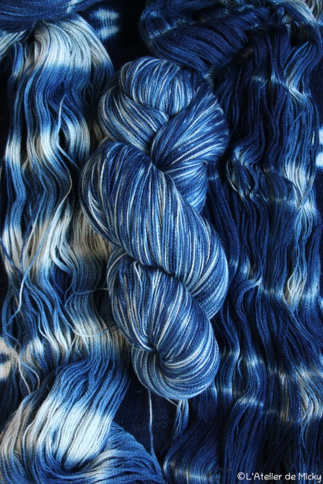 With indigo vats back at work, it’s also time for little knots to be back! Here it’s the gorgeous super fine merino and silk blend thread. To find my « precious » (that’s how I call the skeins of that range) for sale, follow this link.
