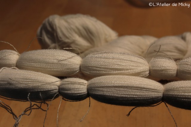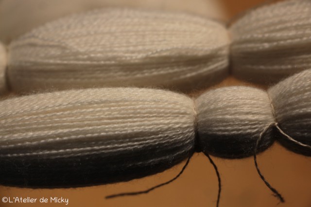 Avec le retour au travail des cuves, c’est aussi le retour des petits noeuds! Ici le superbe fil mérinos et soie très fin. Pour retrouver mes « précieux » (c’est comme ça que j’appelle cette gamme) en vente, c’est par ici.