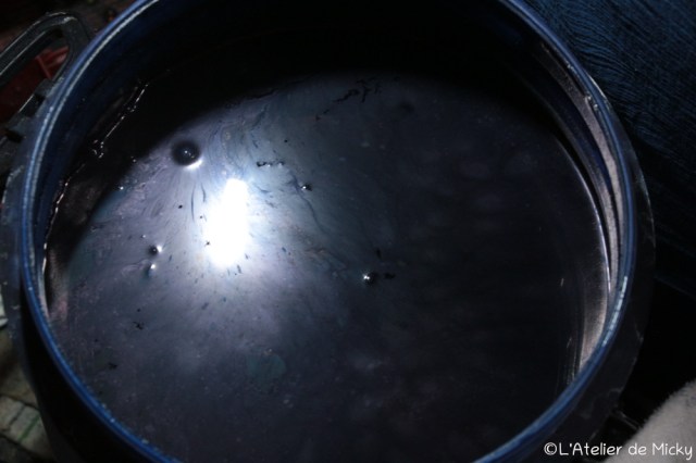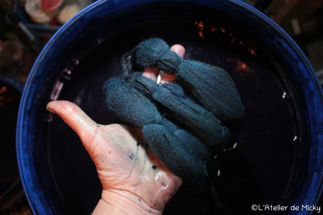 J’ai une autre cuve plus petite au travail, il s’agit de ma cuve de 30 litres que j’emmène en démonstrations et qui a presque 2 ans. Elle est à base d’eau de cendre, de garance et de son de blé. J’y teinte en ce moment des mèches de laine peignée à filer et des écheveaux de laine. Dans ces cuves, la laine est laissée à tremper assez longtemps, contrairement aux pièces en fibres végétales qui sont teintées avec des bains assez courts mais répétés. Comme toujours avec les teintures, il n’y a pas de règles valables pour tout, il faut s’adapter!