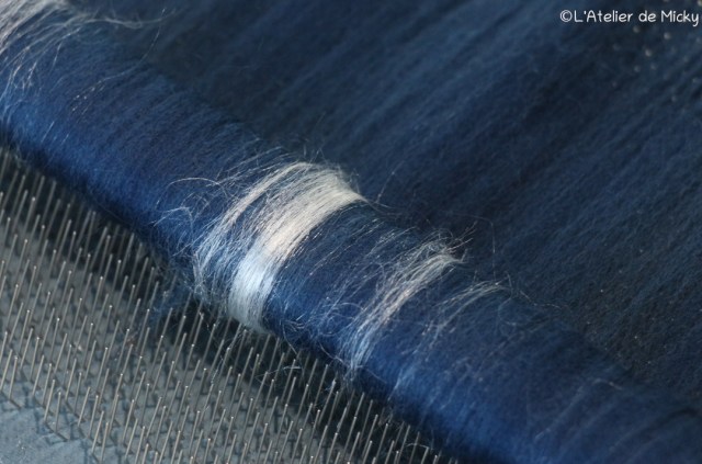 I also started to make some rolags again, on my blending board, for the wool fair near Paris in March. I dyed some wool tops with indigo and here it is mixed with tussah silk. I will also make some with mulberry silk.