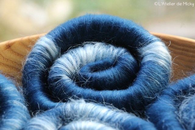 J’ai également recommencé à faire quelques rolags pour la fête de la laine de Malakoff en mars, sur ma planche à mélanger. J’ai teinté de la laine peignée à l’indigo, dans ma cuve en fermentation et ici, elle est mélangée à de la soie tussah. Je vais en refaire avec de la soie maulbère également.