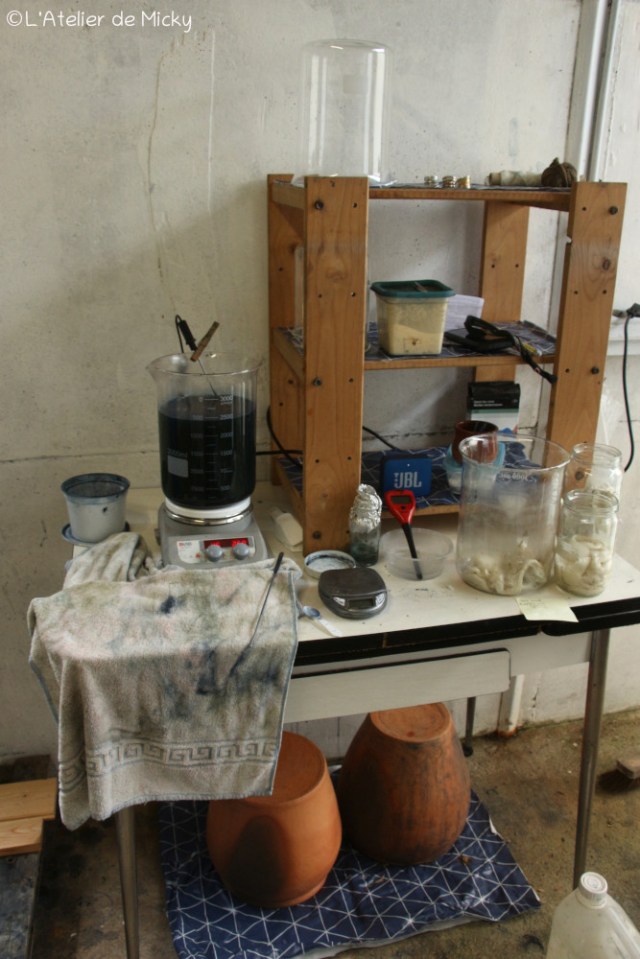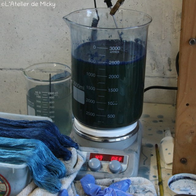 Pour les mini-cuves de bleu au pastel ou à l’indigo, j’utilise une plaque chauffante de laboratoire et un bécher en verre, très pratique pour teinter en tout petits volumes en contrôlant la température.