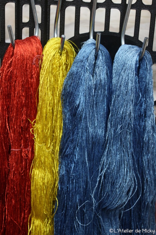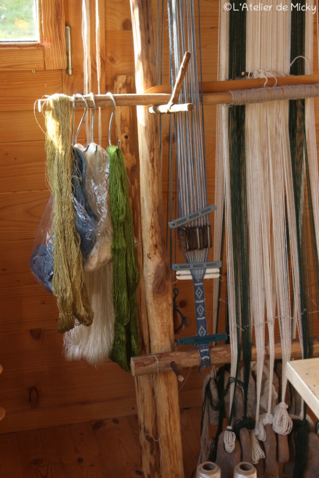 Dans mon atelier, j’ai mon métier à pesons qui me sert en démonstrations, il sert parfois de « porte-trucs » comme ici avec mes soies qui attendent d’être mises en bobines de 100m.