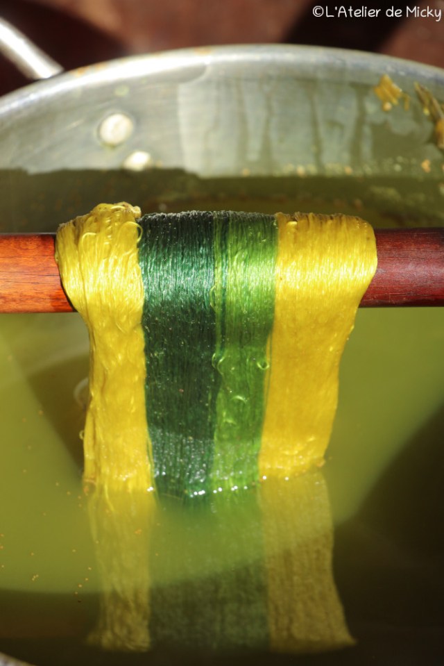 Après un mordançage à l’alun, certaines échevettes sont passées du bleu pastel au vert dans un bain de gaude.