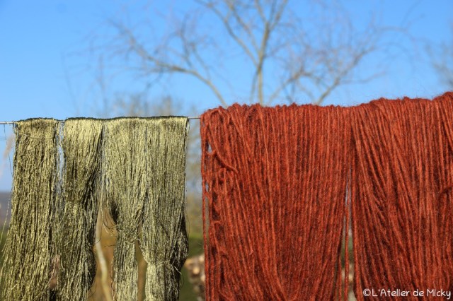 En parallèle, j’ai commencé mes teintures en gros chaudrons et les petites soies sèchent parfois à côté des gros écheveaux de laine.