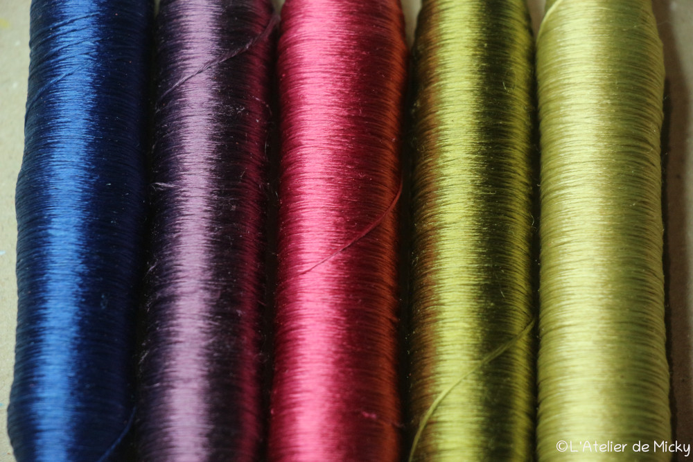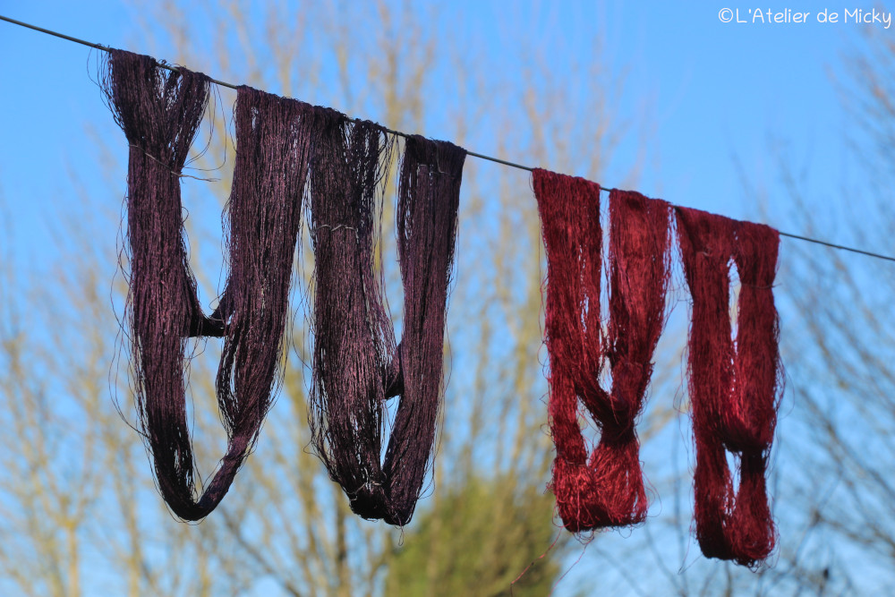 I admit that I always procrastinate a bit before I get to dye it, as it takes a lot of delicacy, which is not my forte. On the other hand, I’m calmer now than I was a few years ago, so there’s less stress! I’ve also improved my skeining and I keep them on hooks and in plastic bags to avoid any unfortunate accidents… As a result, this silk and I have a much more peaceful relationship than before! Here are some pictures of the dyes.