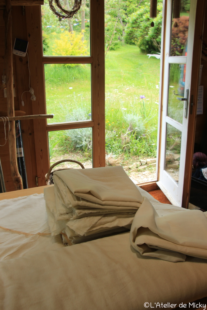 J’avais des demandes de tissus teintés, principalement pour des musées. En rentrant d’un séjour familial au début du mois de mai, je me suis vite mise au travail sur ces pièces avant d’attaquer le reste, car ce sont toujours des teintures qui prennent beaucoup de temps, même quand les pièces sont petites!
