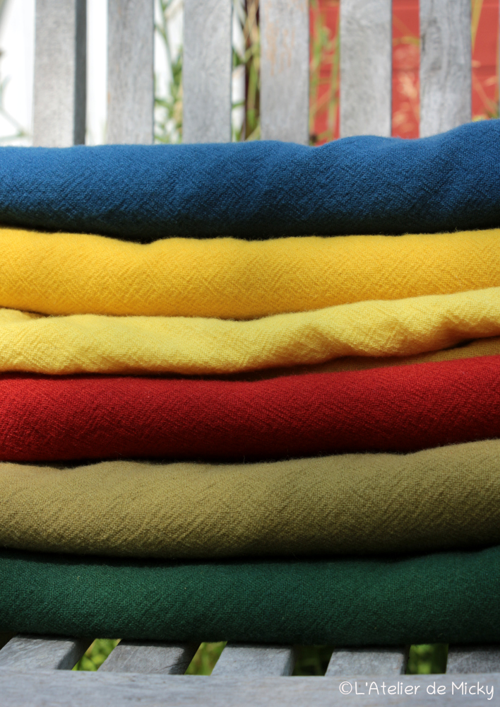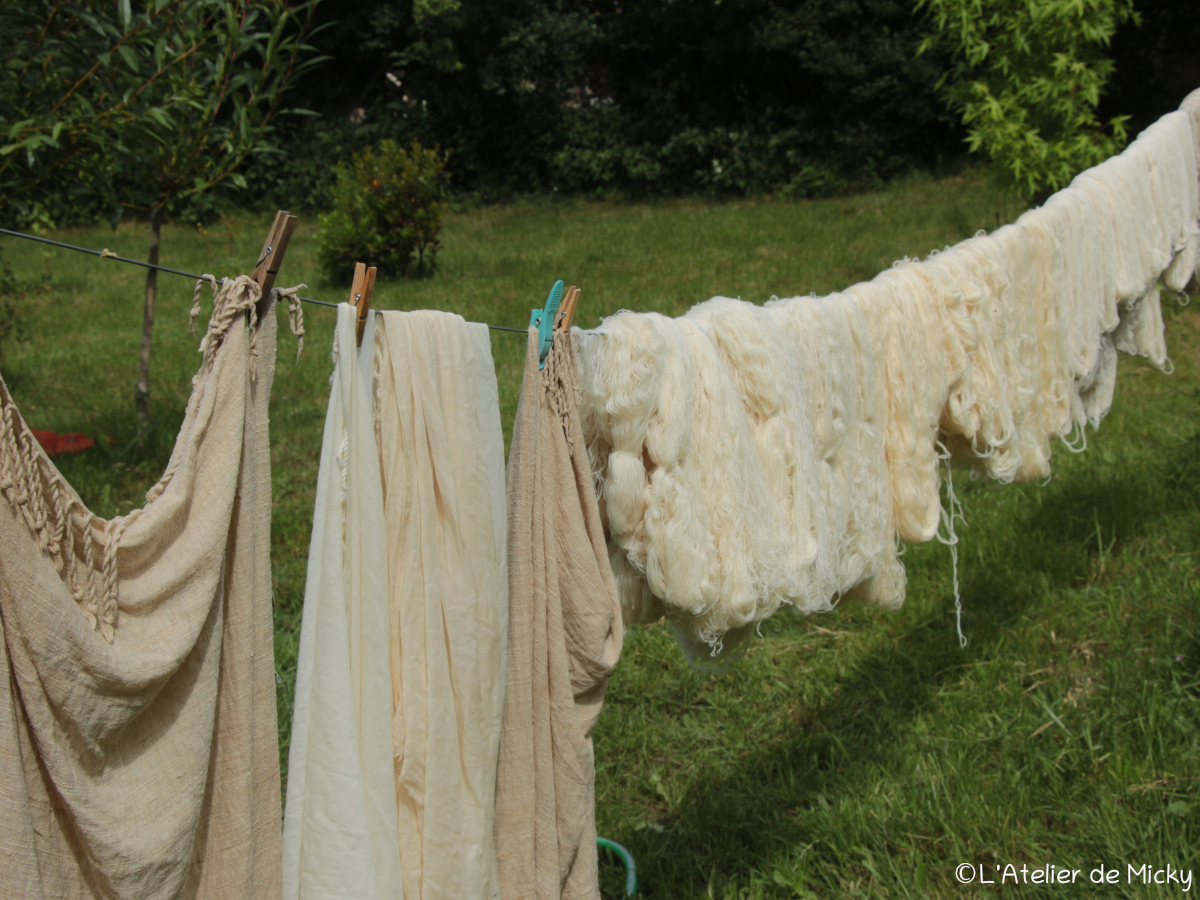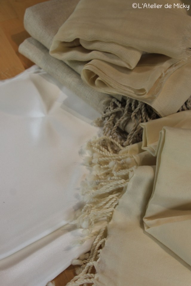 J’en ai profité pour faire le point sur mon stock de tissus non teintés et d’écharpes en soie et laine.