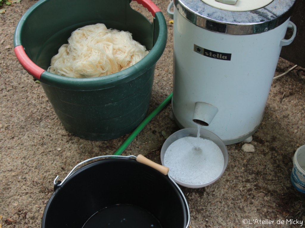 En parallèle de mes tissus, j’ai commencé le gros (et quelque peu ennuyeux) travail de mordançage de tous les écheveaux que je dois teindre pour mon stock. Je vais avoir un planning bien chargé ces prochaines semaines…