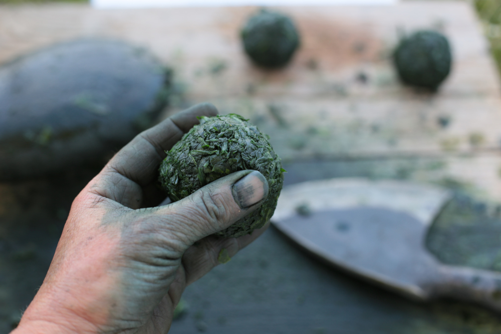 Leave to rest for a few minutes until the solution becomes transparent, then you can mordant your plant fibres, cold. This is a bath with unstable chemistry that cannot be kept for long; it must be redone each time you need it. Knead the fabrics or threads to be dyed for a few minutes, then wring them out lightly before drying them thoroughly.