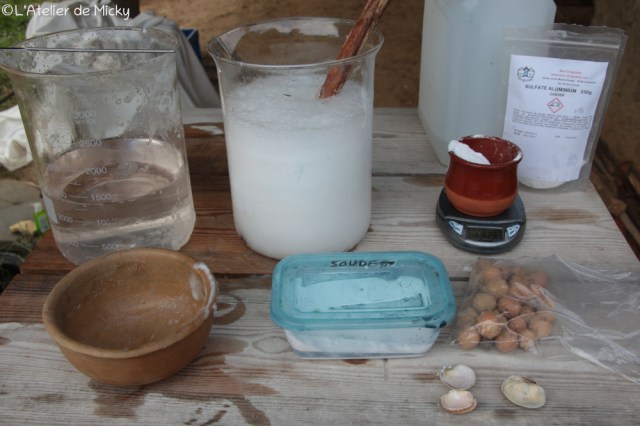 J’ai utilisé le beau soleil du Nord pour faire sécher mes échantillons de tissu, qui dégagent une très forte odeur vinaigrée après ce mordançage. Avant de teindre, il est nécessaire de neutraliser l’acidité avec un bain alcalin. Dans mon cas, j’ai utilisé du blanc de Meudon (craie), parce qu’il m’en restait beaucoup à l’atelier mais on peut utiliser d’autres alcalinisants (voir ici, sur le blog « Slow dyes »)