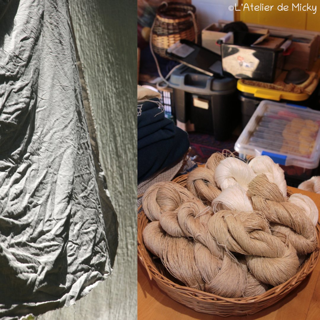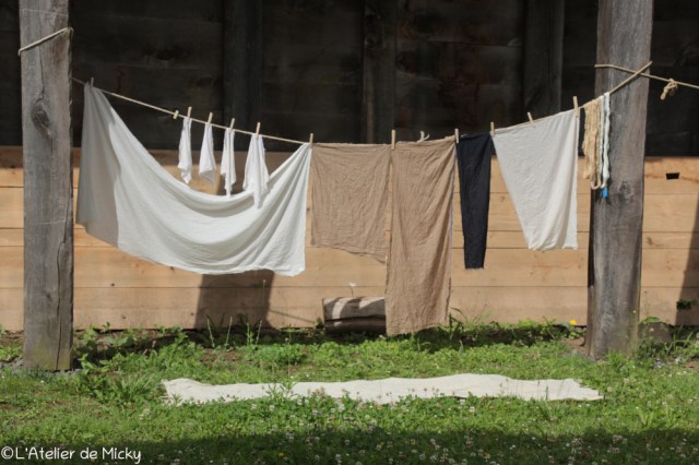 En plus de quelques tissus et écheveaux, j’avais amené un petit projet autour des fibres végétales (lin et chanvre en pièces et en écheveaux). J’ai profité de mon séjour pour comparer deux mordançages, un « moderne » et l’autre plus historiquement correct. Il y a eu pas mal de préparations à faire la semaine d’avant: mise en écheveaux, lavages et décatissages des tissus.