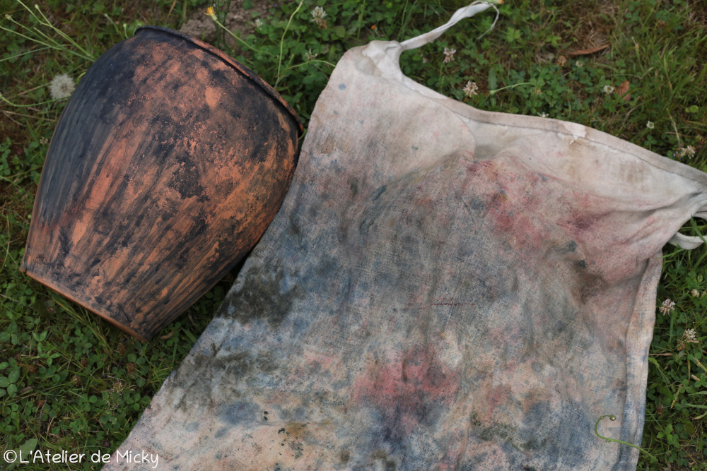So, on site, I used two different mordants. The modern version is the one with aluminium triacetate, based on Michel Garcia’s recipe, which is very simple to make, cold, quick and inexpensive!