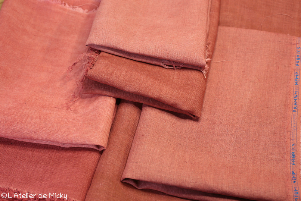 And here’s the results once washed and ironed back home: colors are deeper using the gall/alum method. I still have a few experiments to perform to refine the method for mordanting plant-fiber fabrics. i will keep my gall/alum method for skeins!